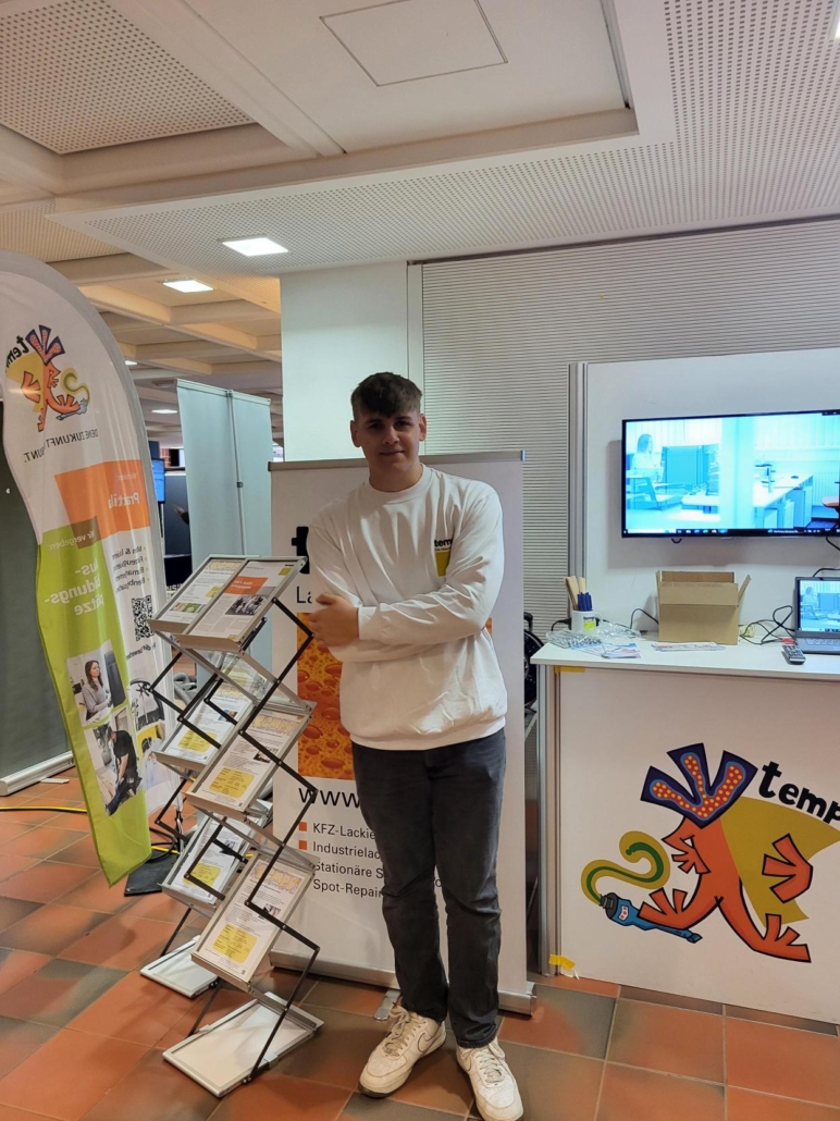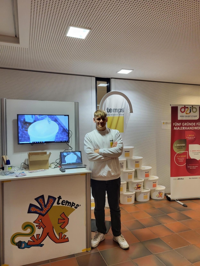 Grau ist alle Theorie! Das wusste schon Johann Wolfgang von Goethe, aber auch unser Team war sich bewusst, was auf solchen Messen zählt. Praxisbezug! Mitmachstationen wurden aufgebaut und die Schülerinnen und Schüler nahmen dieses Angebot gern an. Schließlich lernt man ein Berufsbild am besten kennen, wenn man es direkt ausprobieren kann. Also wurden die Airless-Geräte getestet und ausprobiert, wie genau diese anzuwenden sind. Auch eine Tapezierübung stand auf dem Programm. Hier war viel Feingefühl gefragt, um die Bahnen und damit unseren temps-Muffin exakt und passend aneinander bzw. zusammen zu kleben. Komplettiert wurde das Praxis-Paket durch eine Abklebe-Challenge. Es ging darum, möglichst schnell und sauber eine geometrische Figur abzukleben und dadurch ein Gefühl für das Material zu entwickeln. Insgesamt war es ein toller Tag, der viel Spaß gemacht hat. Besonders taten sich die weibliche Teilnehmerinnen an unserem Stand hervor, die hohes Interesse zeigten und tolle Arbeit abgeliefert haben – so muss das sein!