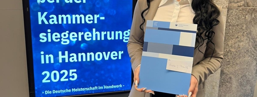 Bei der Kammersiegerehrung der Handwerkskammer Hannover wurde unsere Junggesellin Phoebe Frank für ihre hervorragenden Leistungen ausgezeichnet und zur Kammersiegerin 2025 gekürt. Wir sind stolz auf Phoebe und freuen uns, dass sie die temps-Gruppe bei dieser Ehrung so erfolgreich vertreten hat!