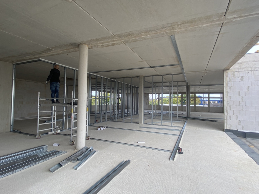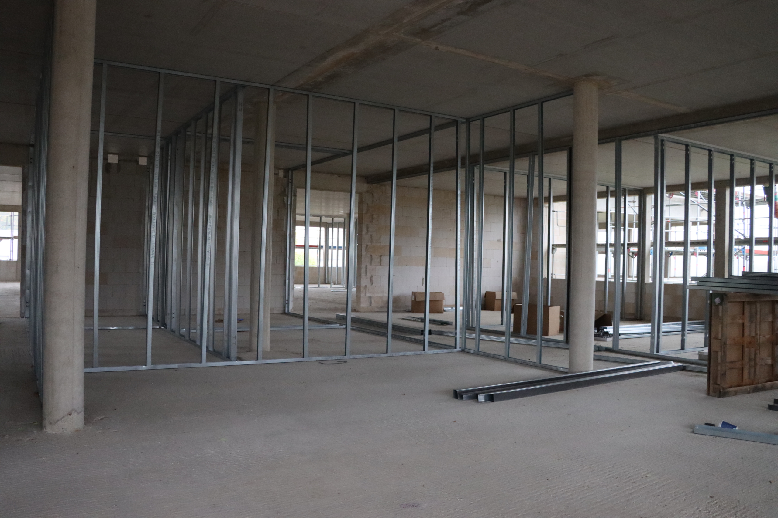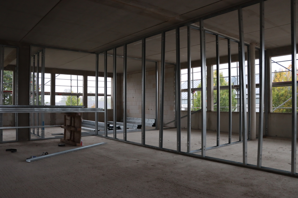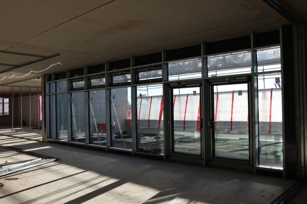 Bereits am Sonntag, einen Tag nach dem Richtfest, sah das Firmengelände in der Hertzstraße wieder so aus wie vor dem Wochenende. Das Orga-Team rund um Dominik Klar hat ganze Arbeit geleistet! Mit Blick auf die kommenden Wochen, den nahenden Herbst und die kalte Jahreszeit, stand das nächste große Ziel bereits fest: Den Neubau dicht und winterfest machen, damit im Innenbereich die technischen Ausbaugewerke starten können. Am 18.09.2025 richteten sich die Trockenbauer von Firma Schier ein. Auf dem Plan standen die Unterkonstruktionen und Ständerwerke für die ersten Trennwände des Gebäudes. Die Firma Burckhardt hat am 08.10.2025 damit begonnen, die ersten Fensterrahmen und Glastüren einzubauen. Auch die Firma Wahl hat mit den ersten Elektroinstallationen begonnen. Für die Gebäudetechnik rund um die Bereiche Heizung, Lüftung und Sanitär begann die Firma Aderhold & Sohn mit den Vorbereitungen.