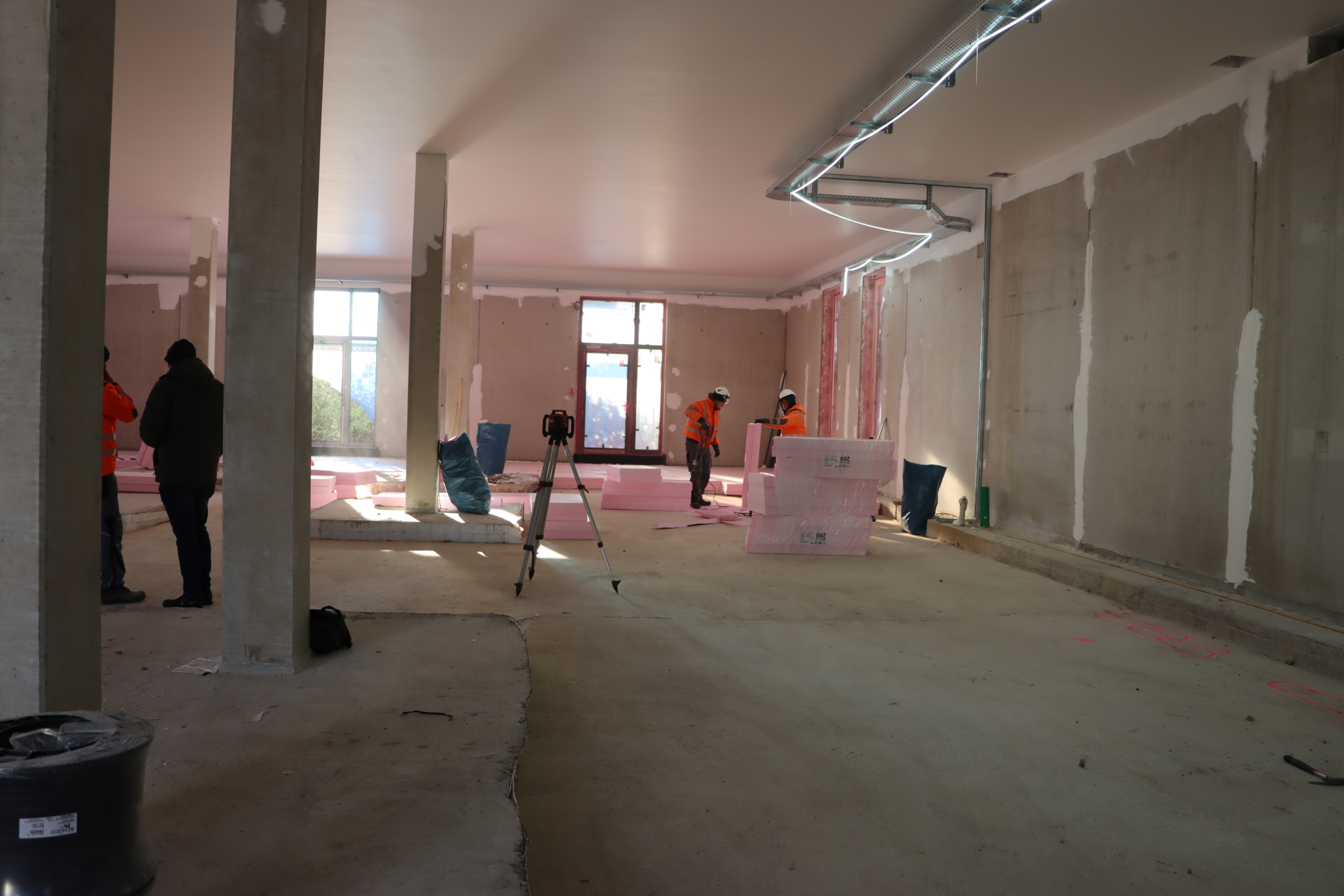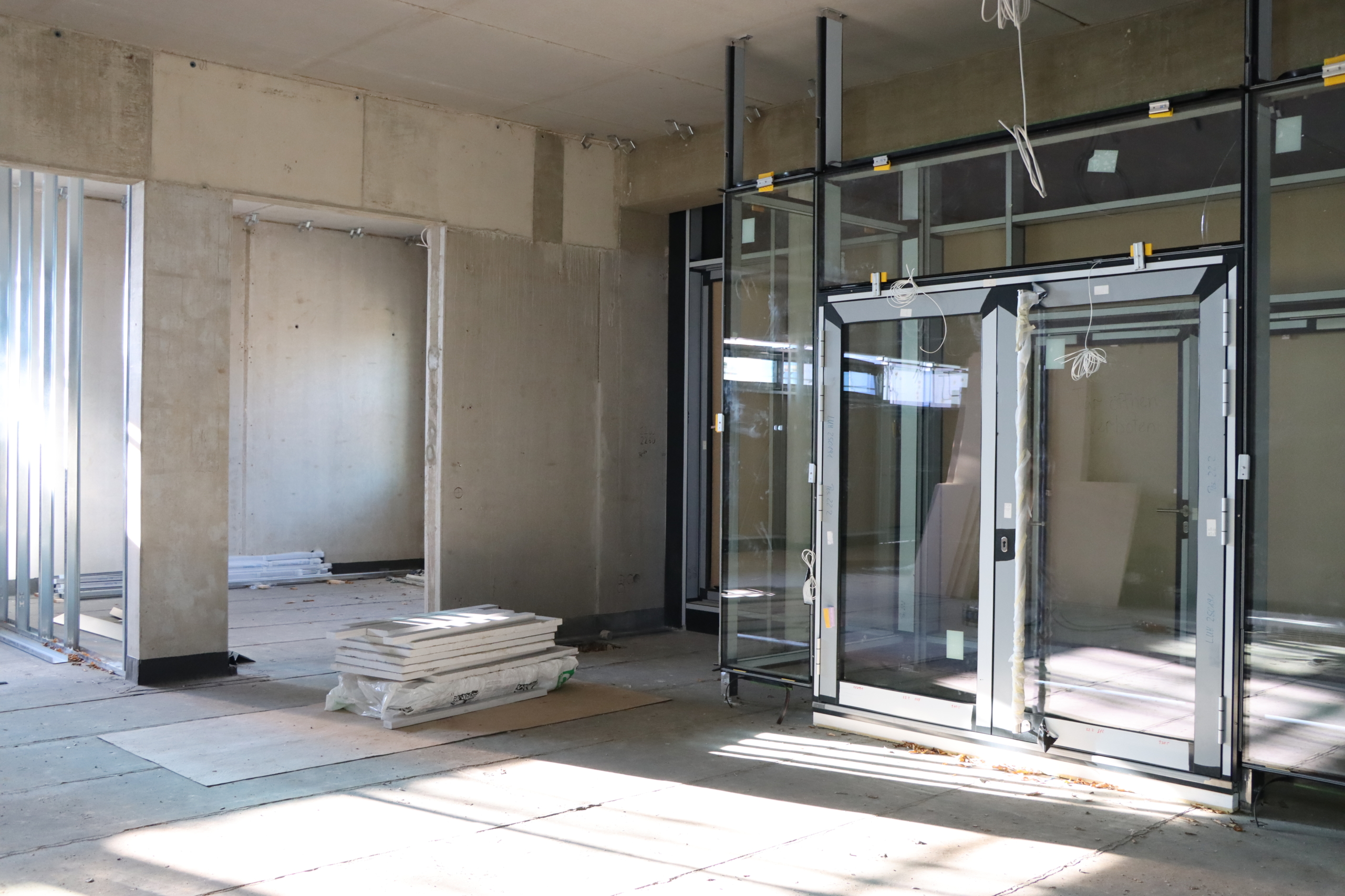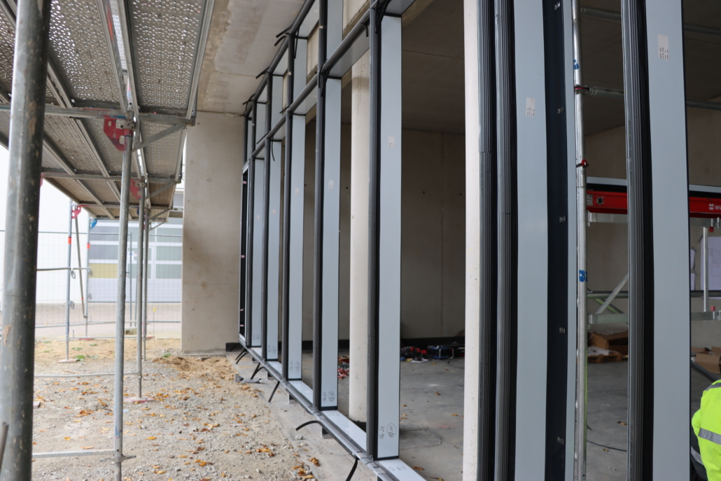 Bereits am Sonntag, einen Tag nach dem Richtfest, sah das Firmengelände in der Hertzstraße wieder so aus wie vor dem Wochenende. Das Orga-Team rund um Dominik Klar hat ganze Arbeit geleistet! Mit Blick auf die kommenden Wochen, den nahenden Herbst und die kalte Jahreszeit, stand das nächste große Ziel bereits fest: Den Neubau dicht und winterfest machen, damit im Innenbereich die technischen Ausbaugewerke starten können. Am 18.09.2025 richteten sich die Trockenbauer von Firma Schier ein. Auf dem Plan standen die Unterkonstruktionen und Ständerwerke für die ersten Trennwände des Gebäudes. Die Firma Burckhardt hat am 08.10.2025 damit begonnen, die ersten Fensterrahmen und Glastüren einzubauen. Auch die Firma Wahl hat mit den ersten Elektroinstallationen begonnen. Für die Gebäudetechnik rund um die Bereiche Heizung, Lüftung und Sanitär begann die Firma Aderhold & Sohn mit den Vorbereitungen.