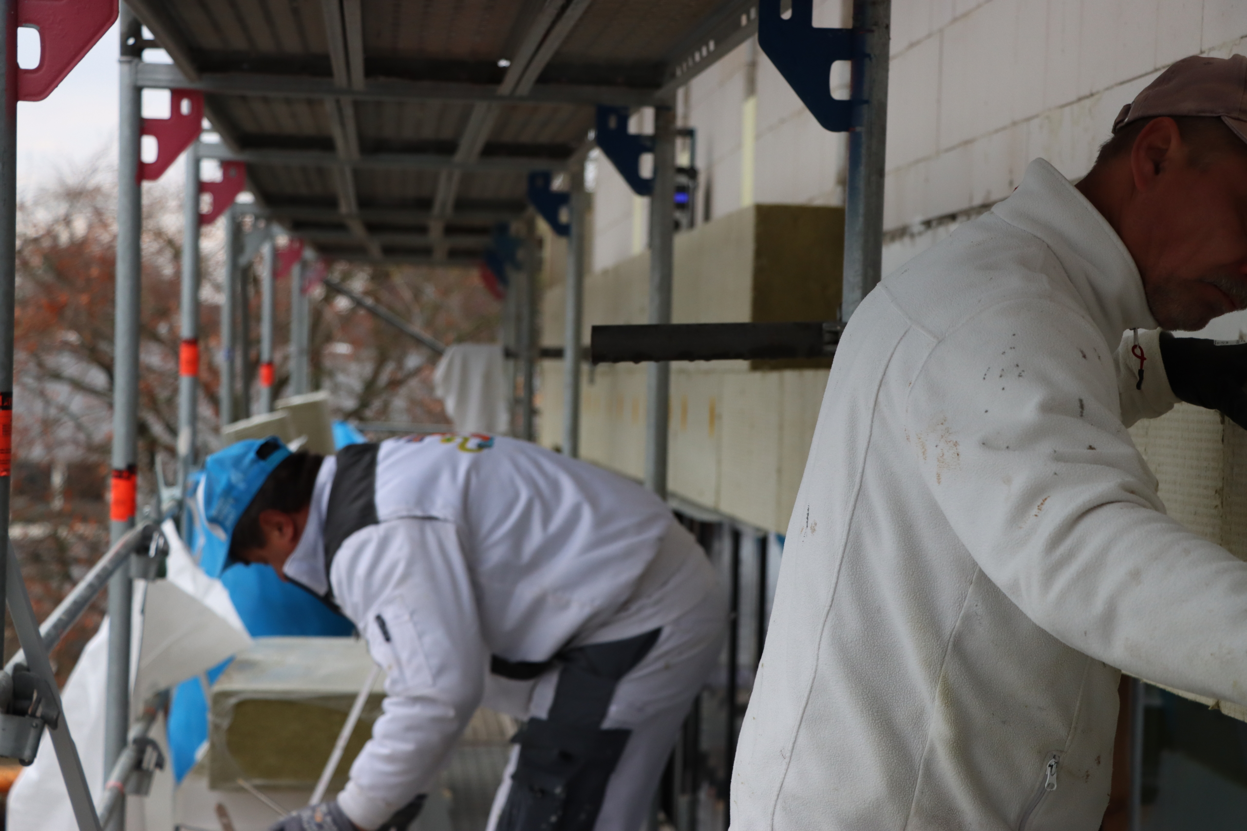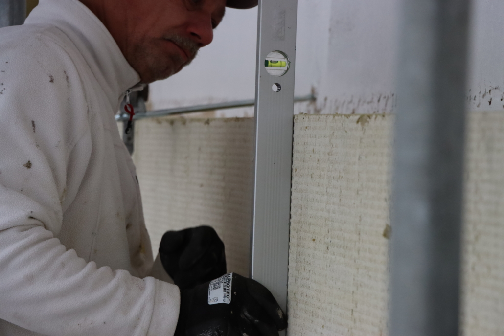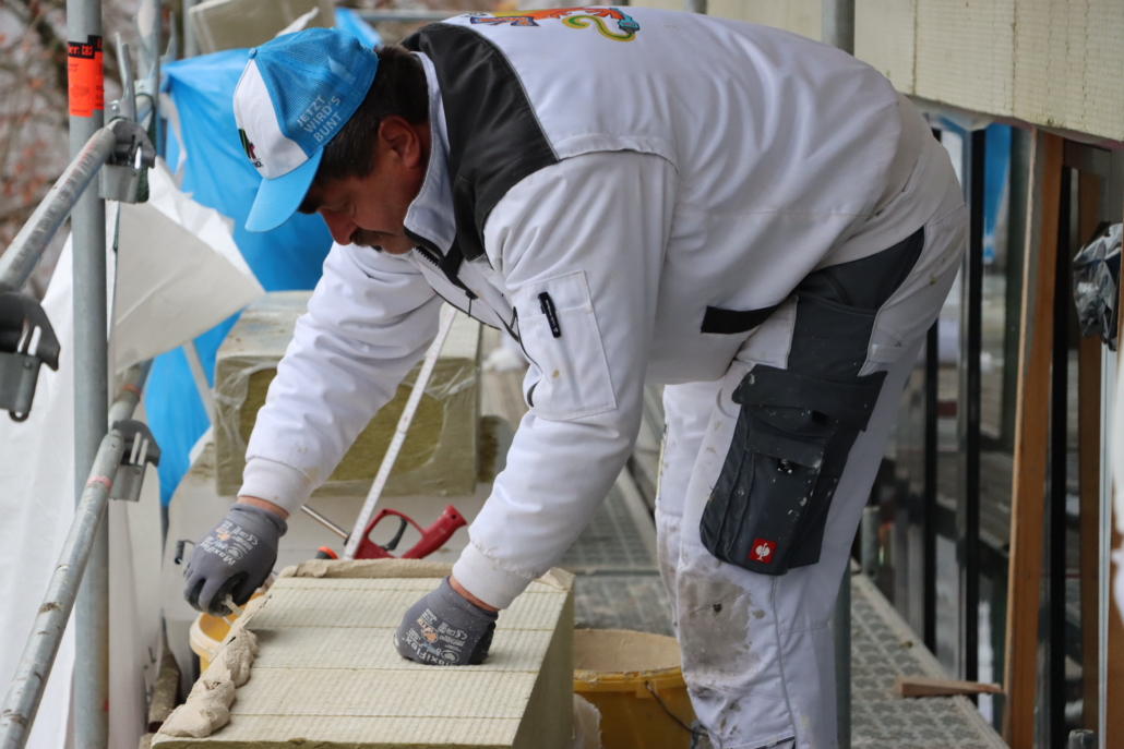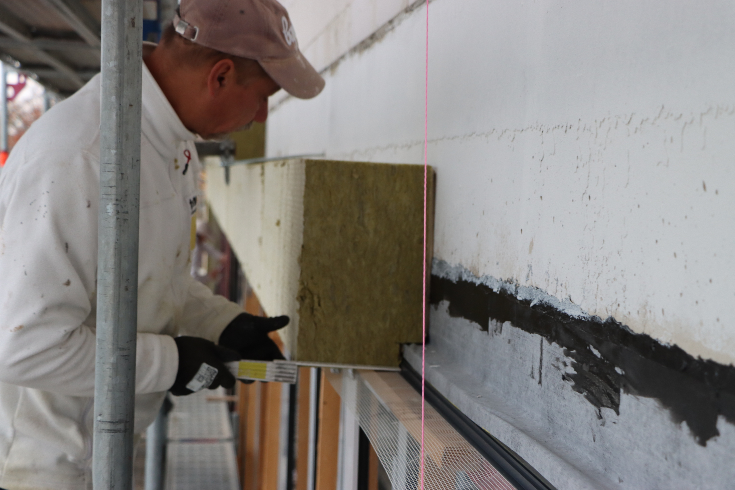 Die Fassadenarbeiten sind für unseren Meisterbereich 6 unter der Leitung von Kay Faulhaber natürlich ein Heimspiel. Nach der Bauwerksabdichtung und dem Setzen der umlaufenden Perimeterdämmung wurden sämtliche Fensteranschlüsse bereits mit passenden Anschlussprofilen versehen. Aktuell wird die Fassade mit 22 cm starken Steinwolle-Dämmplatten verklebt und verdübelt. Im nächsten Schritt wird die gesamte Fläche vorgespachtelt.