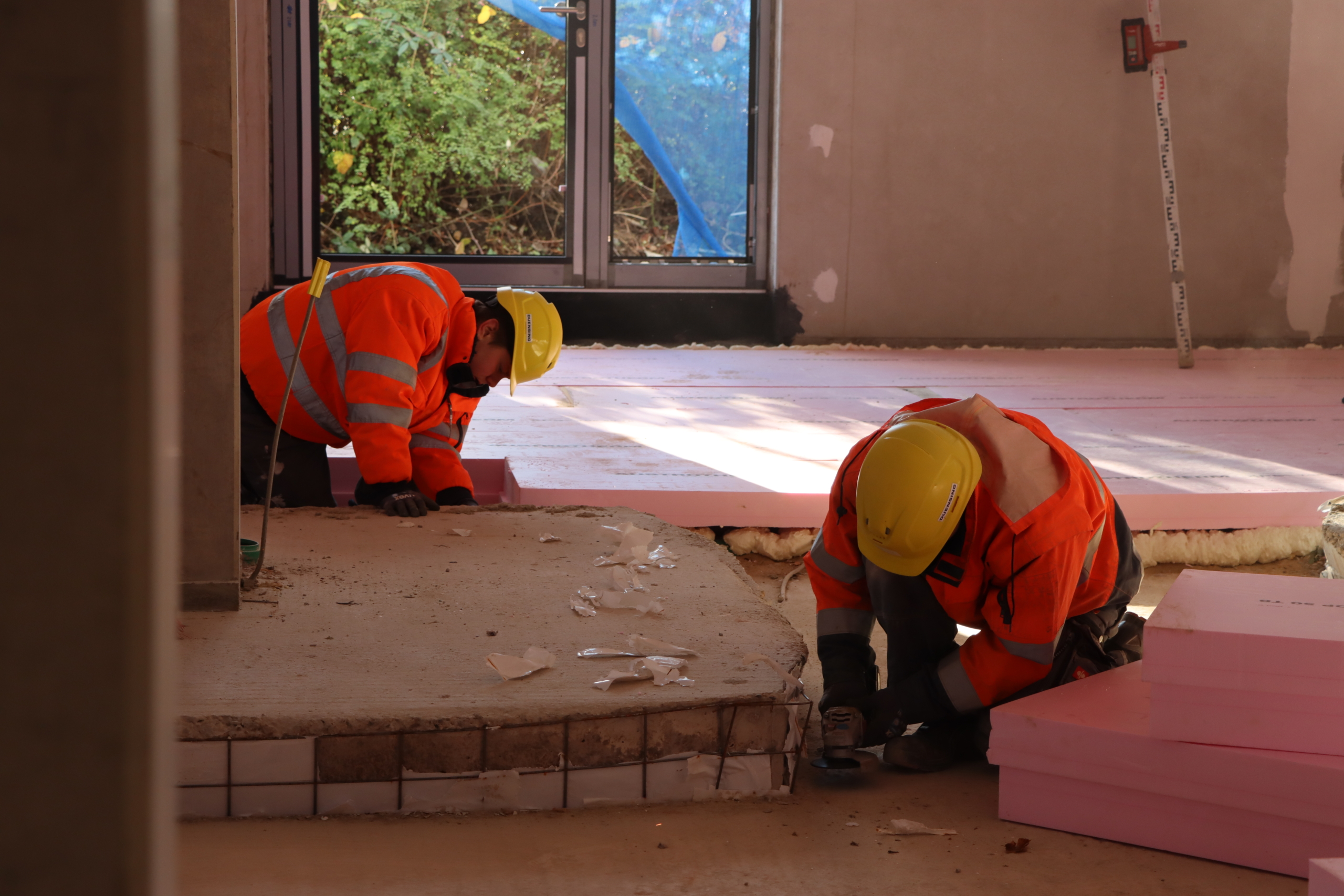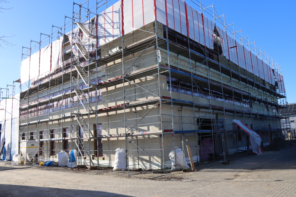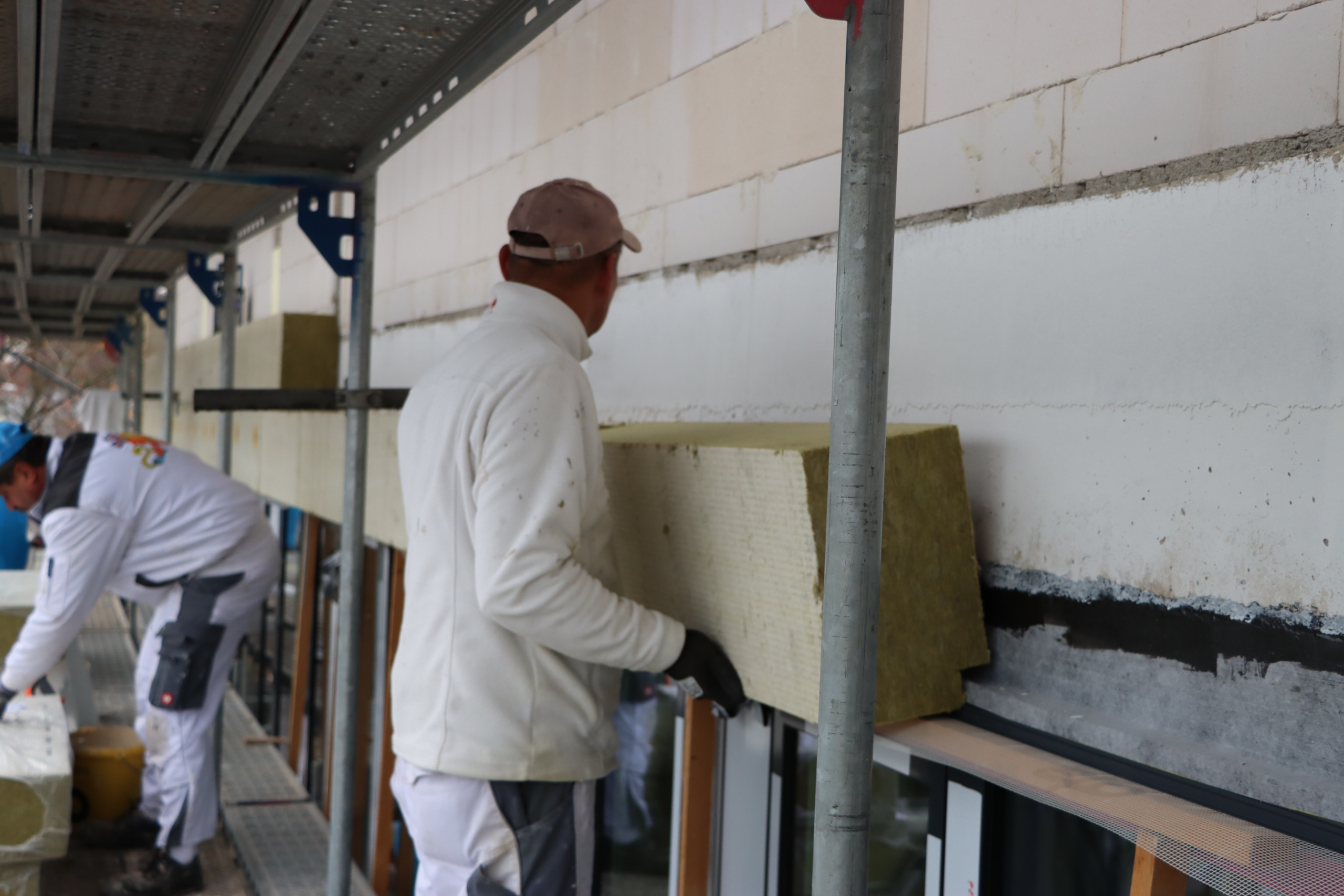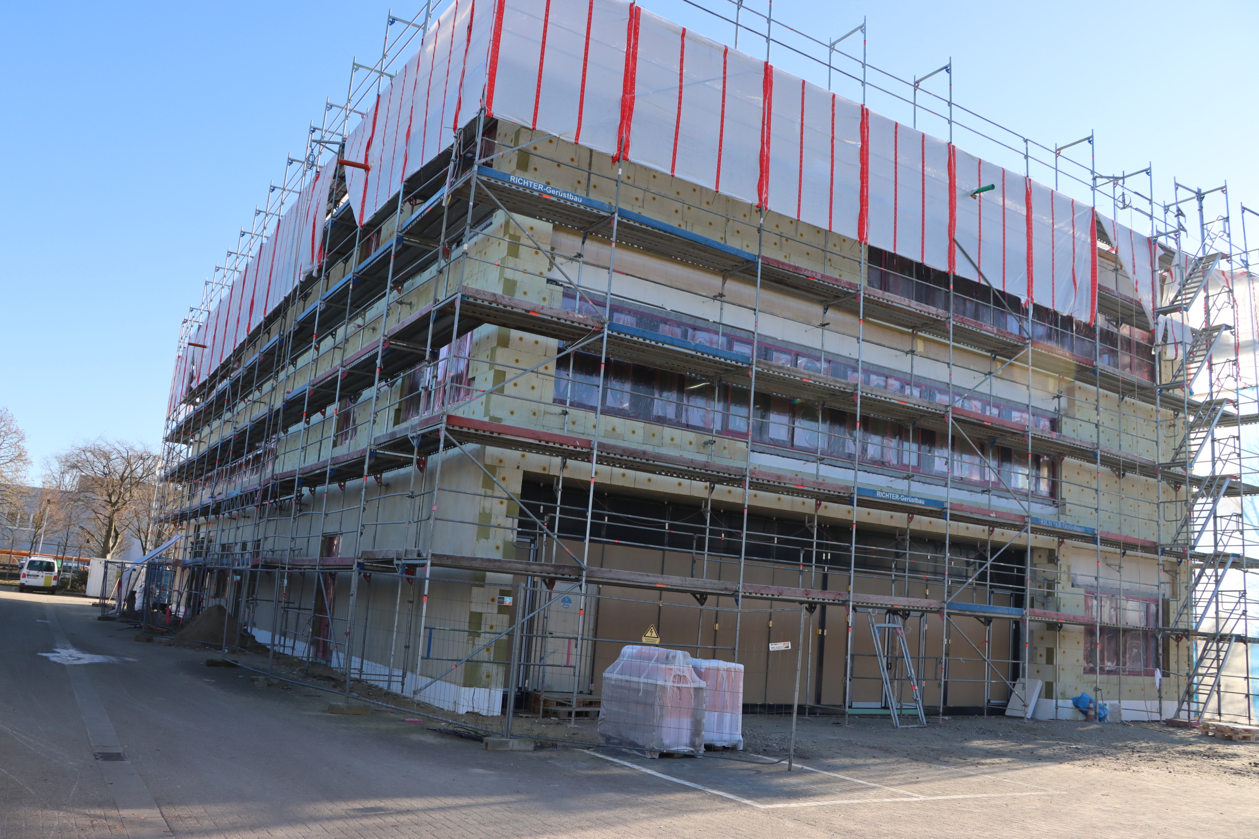 Die Fassadenarbeiten sind für unseren Meisterbereich 6 unter der Leitung von Kay Faulhaber natürlich ein Heimspiel. Nach der Bauwerksabdichtung und dem Setzen der umlaufenden Perimeterdämmung wurden sämtliche Fensteranschlüsse bereits mit passenden Anschlussprofilen versehen. Aktuell wird die Fassade mit 22 cm starken Steinwolle-Dämmplatten verklebt und verdübelt. Im nächsten Schritt wird die gesamte Fläche vorgespachtelt.