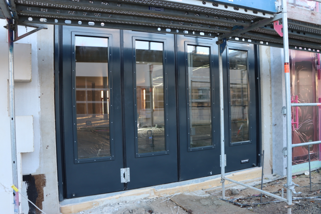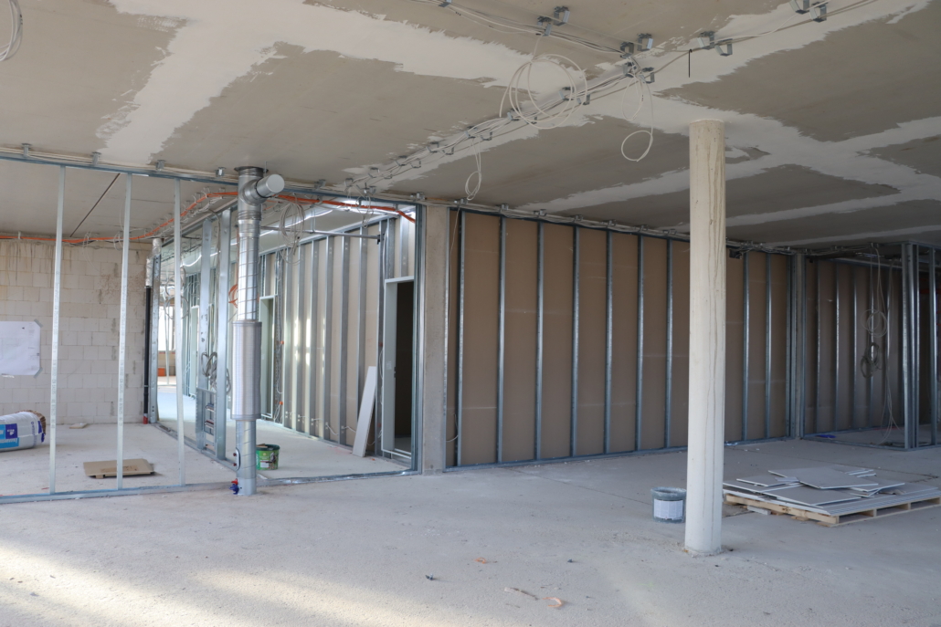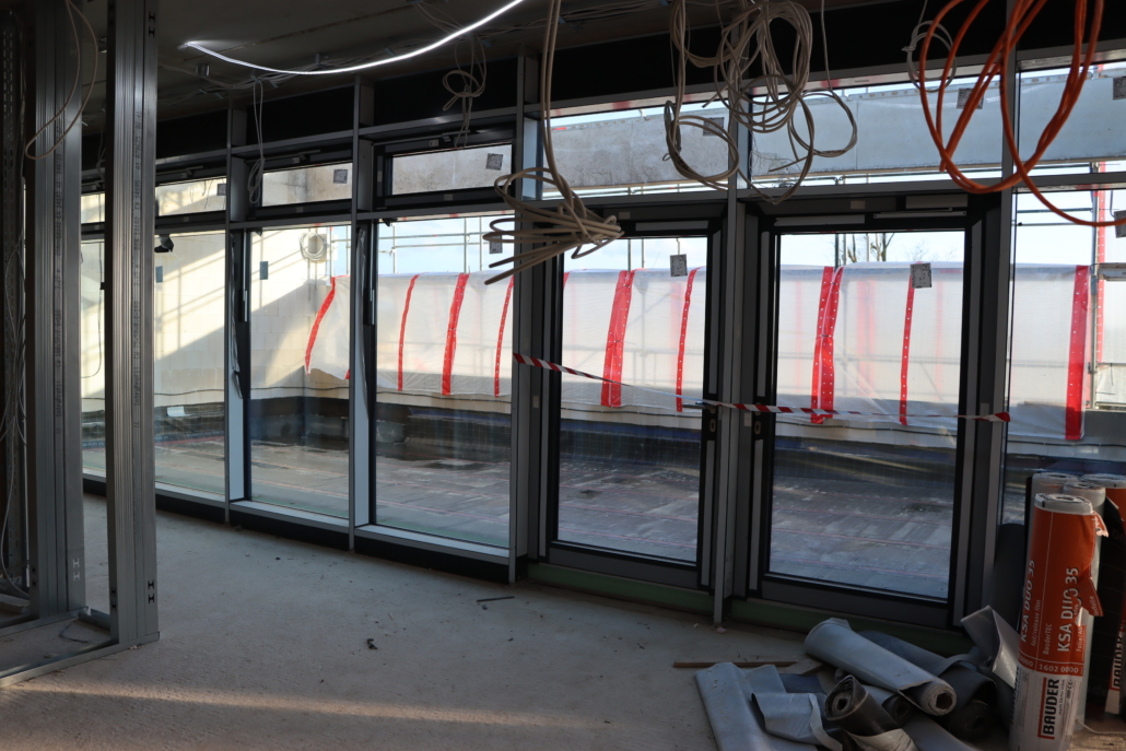 Bereits am Sonntag, einen Tag nach dem Richtfest, sah das Firmengelände in der Hertzstraße wieder so aus wie vor dem Wochenende. Das Orga-Team rund um Dominik Klar hat ganze Arbeit geleistet! Mit Blick auf die kommenden Wochen, den nahenden Herbst und die kalte Jahreszeit, stand das nächste große Ziel bereits fest: Den Neubau dicht und winterfest machen, damit im Innenbereich die technischen Ausbaugewerke starten können. Am 18.09.2025 richteten sich die Trockenbauer von Firma Schier ein. Auf dem Plan standen die Unterkonstruktionen und Ständerwerke für die ersten Trennwände des Gebäudes. Die Firma Burckhardt hat am 08.10.2025 damit begonnen, die ersten Fensterrahmen und Glastüren einzubauen. Auch die Firma Wahl hat mit den ersten Elektroinstallationen begonnen. Für die Gebäudetechnik rund um die Bereiche Heizung, Lüftung und Sanitär begann die Firma Aderhold & Sohn mit den Vorbereitungen. Pünktlich vor Weihnachten wurde in den letzten Tagen der Woche 51 die Sohle im Lager gegossen, die über den Jahreswechsel genug Zeit zum Trocknen hatte. Zu Beginn des Jahres 2026 wurde das Rolltor für unser neues Lager von der Firma Burckhardt eingebaut.